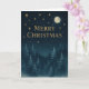 Envoyez des voeux de vacances élégants avec cette carte de Noël étoilée. Une lune brillante et des étoiles dorées brillent au-dessus d'une pinède enneigée, créant une scène hivernale magique.