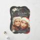 Carte de Noël contemporaine avec une forme en découpage en forme de crochet ornée de fleurs blanches et rouges, de branches de pin et de baies sur un fond moderne de tableau noir.