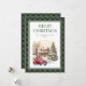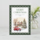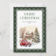 Camion d'aquarelle rouge Joyeuse carte de Noël avec un paysage hivernal et un camion rouge à l'intérieur d'un cadre de plaid de buffle vert.