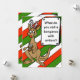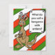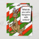 Carte de Noël festive avec arrière - plan rayé rouge blanc et vert. Kangourou de dessin animé avec bois et nez rouge et énigme de Noël pour enfants ou blague sur le devant