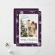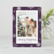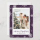 Carte de Noël violette avec des flocons de neige sur un arrière - plan pourpre enneigé. Personnalisez facilement cette carte photo de Noël avec votre photo et le nom de famille.