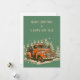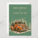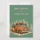 carte de noël rétro d'une vieille ramasseuse orange dans la neige et les pins de l'arrière - plan