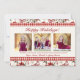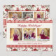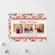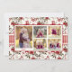 Un motif floral d'hiver traditionnel classique avec des poinsettias rouges, des baies et de la verdure, avec une bordure à carreaux rouge, fait l'arrière-plan de cette carte qui présente 3 photos sur le devant, avec de la place pour votre choix de message principal, plus une deuxième ligne de message et une ligne pour les noms, la date ou une citation favorite. L'intérieur présente le même motif floral avec de la place pour 5 photos et une ligne de texte ou une date.