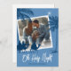 Carte de Noël religieuse moderne avec un fond bleu, une photo à remplacer par la vôtre, les trois rois mages, des palmiers du désert, la phrase festive hivernale 'oh sainte nuit', et le nom de votre famille.