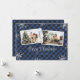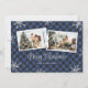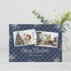 Carte de Noël personnalisée avec des flocons de neige et deux photos contre un motif bleu en plaid de buffle. Personnalisez facilement cette carte de Noël avec vos photos et un nom de famille.