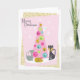 Une carte de Noël de style rétro avec des chats malicieux illustrés autour d'un sapin rose.