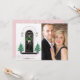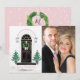 Avec un porche avant classique décoré pour les fêtes, avec des arbres de Noël surmontés d'étoiles encadrant la porte noire élégante, une couronne de pin avec un nœud en vichy rose, et des lanternes surmontées de roses et de houx. Dans le style de Magnolia | ferme moderne | classique élégant. L'arrière présente un fond enneigé rose avec la même couronne et le même nœud en vichy rose entourant votre monogramme. Ajoutez votre propre portrait de famille pour un message de Noël personnalisé !