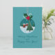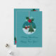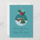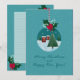 Carte de fêtes festive de couleur sarcelle avec un ornement en verre représentant un village sous la neige et un sapin de Noël, orné de houx et d'un ruban rouge. Fond enneigé et vœux manuscrits. Personnalisez les noms, l'année et le message à l'intérieur - idéal pour la famille, les amis, les professeurs et les collègues.