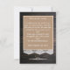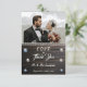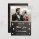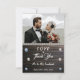 Le design est en bois foncé rustique chaud avec perles blanches et perles bleues sous la photo. Derrière la carte, il y a un espace pour écrire un message plus personnel. Il est marron clair et décoré de dentelle blanche. Une ligne de fin élégante avec un coeur au bas de la carte donne une touche de finition agréable.