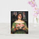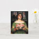 Boutons de rose du YE de rassemblement de John William Waterhouse tandis que carte de note du YE mai. Peinture à l'huile sur la toile à partir de 1909. Basé sur le poème de Robert Herrick, les boutons de rose du YE de rassemblement est l'un des ouvrages littéraires les plus fins de peintre du château d'eau anglais de John. La peinture comporte une belle fille dans une robe verte avec la dentelle d'or et la broderie florale. La jeune femme tient une cuvette d'étain fraîchement de roses de rose, de rouge, et blancs de coupe dans des ses mains. Ses cheveux rouge foncé sont attachés avec des perles, et un miroir posté derrière elle indique une fenêtre en verre teinté comportant un manteau des bras et des tulipes pourpres. Un grand cadeau pour des fans de J.W. Waterhouse, art anglais romantique, peinture littéraire, et les Pre-Raphaelites.