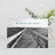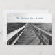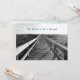 Cartes d'annonce de nouvelle adresse sur le thème côtier. Les cartes plates ont du texte et des images sur les deux côtés. Une image de promenade en bois en noir et blanc sur le devant, avec une ligne de texte bleu foncé sur le dessus. Ajoutez plus d'informations au verso de la carte sur une scène de plage avec une grande coquille rejetée par la mer.