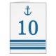 Elégante et classique Ancre Nautique Carte Numéro de table avec une simple ancre de bateau et un ensemble de rayures en bleu marine foncé et blanc. Cette carte de table mariage à thème de plage nautique peut être facilement customisée avec vos détails de mariage. Pour plus d'options de personnalisation, cliquez sur le bouton Customiser.