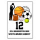 Carte de numéro de table d'événement sportif faite en blanc, avec des graphiques d'une silhouette noire d'un enfant jetant une balle, football, volley, football, basket, basket, baseball, et balle de tennis. Le nombre noir et le texte en bas sont prêts à personnaliser pour lire ce que vous voulez. Personnalisez le numéro et le texte, un pour chaque table de votre événement. La couleur arrière - plan peut facilement être changée en n'importe quelle couleur que vous voulez en mode personnaliser.