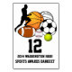 Carte de numéro de table de l'événement sportif fait en blanc, avec des graphiques d'un coureur de piste, football, volley, football, basket, baseball, et tennis. Le nombre noir et le texte en bas sont prêts à personnaliser pour lire ce que vous voulez. Personnalisez le numéro et le texte, un pour chaque table de votre événement. La couleur arrière - plan peut facilement être changée en n'importe quelle couleur que vous voulez en mode personnaliser.