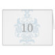 Simple avec élégance chic décrit cette carte subtile Mariage damassé Numéro de Table Card avec un arrière - plan bleu clair damassé fleuri. Cette carte de table classe est parfaite pour un mariage traditionnel et peut être facilement customisé avec un ou des numéros de table ou vos coordonnées de mariage. Pour plus d'options de personnalisation, cliquez sur le bouton Customiser.