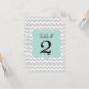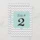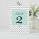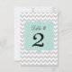 Élégante carte de numéro de table de réception de mariage de style plat réalisée dans un motif chevron zigzag gris clair et blanc tendance. Une zone de texte décorative vert menthe comporte du texte noir prêt à être personnalisé. Personnalisez le texte sur le recto et le verso pour chaque table à votre réception.