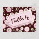 Une jolie illustration est ornée de motifs coordonnés de cercles et de points à l'ombre de rose et de vert sur un arrière - plan de chocolat foncé dans cette carte amusante et amusante de numéro de table. Créez une carte pour chaque table - concevez des impressions à la fois sur l'avant et sur l'arrière.