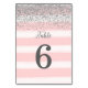 Carte de numéro de table mariage avec parties scintillant fausse argent design et aquarelle rose rayures arrière - plan.