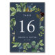 Les cartes de numéro de table chic du jardin comportent une bordure de feuillage vert aquarelle et de feuilles d'eucalyptus, encadrant votre numéro de table en blanc sur un arrière - plan bleu fumé. Personnalisez avec vos noms et votre date de mariage, ou nommez chaque table pour une touche personnelle supplémentaire. Le design se répète à l'envers. Coordonnée avec notre suite de faire-part de mariage Eucalyptus Grove.