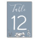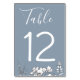 Fleurs de prairie dessinées à la main dans le blanc et le charbon de bois doux sur arrière - plan bleu poussiéreux, cartes de numéro de table mariage. Customiser le style, la couleur et la taille de la police de texte. Conçu pour correspondre à notre collection Dusty Blue Meadow.