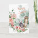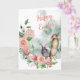 Sur le devant de cette jolie carte de saison de Pâques, on voit deux lapins adorables, un brun et un gris. Les lapins sont entourés d'une demi-couronne de fleurs printanières roses pâles, avec un fond en éclaboussure d'aquarelle vert pâle. Le texte rose corail assorti dit "Joyeuses Pâques". L'intérieur de la carte comporte deux champs de texte personnalisés et un bouquet de fleurs assorti avec une colombe blanche descendant dessus. Très délicat et tellement approprié pour la saison de Pâques. Tout le texte peut être facilement modifié comme vous le souhaitez.