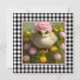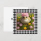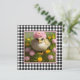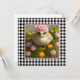 Jolie carte de Pâques carrée avec une peinture d'art numérique d'un poussin parmi des fleurs roses et jaunes sur un fond à carreaux noir et blanc. Personnalisez le message "Joyeuses Pâques" au verso.