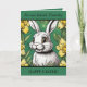 Carte de Pâques modifiable avec un lapin de Pâques et des jonquilles. Texte modifiable.