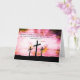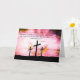 Carte de Pâques avec trois croix dans un coucher de soleil rose et verset biblique, "2 Corinthiens 5:17