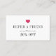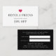 Encouragez les clients à recommander des amis avec ces cartes de référence chic en noir et blanc avec un pop de rose fuchsia. Parfait pour les salons, les techniciens de clous, les maquilleurs et les boutiques, notre design moderne et simple est doté d'un coeur rose chaud avec "référer un ami" et votre offre de référence montrée sur le devant (montré avec "vous recevrez 20% de réduction"). Personnalisez l'envers avec vos conditions de référence, votre nom d'entreprise, votre emplacement et vos coordonnées. Inclut l'espace pour les noms du référent et du nouveau client.
