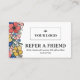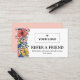 Carte de recommandation fleurie colorée avec des fleurs en corail, rose, bleu et jaune et votre logo d'entreprise sur une face et un fond rose corail clair doux sur l'autre face où vous pouvez écrire à la main le nom du nouveau client et le nom du client qui recommande. Carte vibrante et accrocheuse "recommandez un ami" personnalisée avec votre logo, et imprimée avec de nombreuses fleurs fantaisistes dessinées à la main et des polices charmantes. Carte de recommandation personnalisée avec logo et fleurs folkloriques en jaune, corail et bleu pour votre salon, institut de beauté, petite entreprise. Carte "recommandez un ami" pour petite entreprise personnalisée avec un joli design floral inspiré par la fantaisie folklorique et les couleurs des prairies estivales.