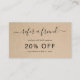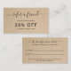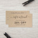 Carte simple de référence d'affaires avec "référez un ami" avec des swashes dans une police de script manuscrite élégante sur un arrière - plan de papier brun rustique. Le côté arrière contient le formulaire de référence et vos coordonnées. Ce design féminin est idéal pour une entreprise artisanale artisanale.
