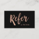 Ces cartes d'aiguillage d'entreprise simples et modernes présentent une typographie manuscrite en or faux rose sur un arrière - plan noir, pour un look glamour et minimaliste que votre client aimera. Ce look sobre mais pointu conviendra à presque tous les types d'entreprises, du maquilleur à la coiffeuse en passant par le maquilleur, le maquilleur ou encore le spa ou la vente au détail. Le dos contient beaucoup de place pour vous de customiser totalement avec votre magasin ou les informations de votre entreprise.