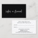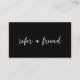 Carte de référence moderne avec un design simple et minimal avec "référez un ami" dans un script élégant sur un arrière - plan noir Le dos a vos icônes de médias sociaux et les informations de contact. Vous pouvez supprimer les modifications, ajouter ou supprimer les icônes dans l'outil d'édition de conception. Ces cartes de référence minimums sont idéales pour toute entreprise.