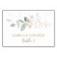 Elégante carte plate avec une illustration de feuillage vert et or en aquarelle. Sur le dessus de la carte - l'effet or confetti. Vous pouvez modifier le numéro de table à vos exigences (2, 5...7...10...) - chaque fois une nouvelle carte, et ajouter toutes ces cartes à votre panier.