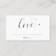 Carte d'escorte du mariage de typographie avec le mot "amour" en calligraphie noire avec un choc cardiaque à la fin, sur un arrière - plan blanc. Le dos est noir. Les couleurs arrière - plans peuvent être changées en n'importe quelle couleur. La disposition simple et minimaliste et beaucoup d'espace ouvert donnent à ce design une atmosphère moderne et la calligraphie lettrée et coeurs lui donnent une touche romantique. Vous trouverez ci-dessous une ligne pour écrire à la main le nom et le numéro de table de chaque invité.