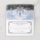 Préparez-vous pour un mariage de destination à la Nouvelle-Orléans ! Les bords sont inspirés par les panneaux de rue et la ferronnerie emblématique du Big Easy, et bien sûr la Fleur de Lis fait son apparition ! Les couleurs (violet, or et bleu clair) rappellent celles de Mardi Gras sans être franches et sont déclinées en sobriété pour leur élégance. Une aquarelle du quartier français et de la cathédrale Saint-Louis orne l'arrière. Excitez vos invités pour un mariage où les bons moments se dérouleront !