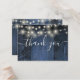 Un élégant bleu rustique grange lampes à cordes mariage merci carte de réception, personnalisée avec un message spécial et les noms de la mariée et du marié. Conçu par Thisisnotme©