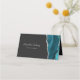 Cette carte de placement de table de mariage élégante et moderne présente une bordure d'agate en aquarelle bleu sarcelle ornée de faux éclats argentés. Le recto de la carte comporte des espaces pour le nom de l'invité et le numéro de table. Le mot "table" apparaît en écriture manuscrite grise argentée avec des fioritures avant et après sur un fond noir délavé. Personnalisez le verso de la carte avec les noms de la mariée et du marié en écriture manuscrite grise argentée et la date du mariage en dessous.