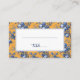 This wedding place card features a vibrant orange background adorned with a repeating floral pattern in shades of blue, creating an elegant and cheerful atmosphere. The design includes a central white rectangle bordered by a thin blue line, providing space for customizable text, perfect for personalizing each guest's seating arrangement. The mix of script and sans-serif typography adds a touch of sophistication, while the detailed botanical illustrations evoke a classic and inviting feel. Ideal for festive occasions, this card combines traditional charm with modern style, making it a delightful addition to any wedding celebration.