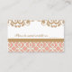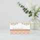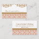 Elégante et belle carte de table mariage d'inspiration carrelée marocaine avec un motif motif géométrique en corail et or répétitif et une bordure fleurie de style baroque français doré. Nos cartes de table haut de gamme et luxueuses sont parfaites pour un mariage à thème marocain, arabe ou aladdin. L'avant et l'arrière de ces cartes personnalisées peuvent être personnalisées avec les noms de la date de la mariée et du marié et du mariage et un message spécial pour vos invités. Oeuvre et design © Chrissy H. Studios, LLC. Tous droits réservés.