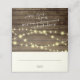 Bois de grange rustique et lampes à cordes plié carte de séjour avec espace blanc pour écrire les noms et le numéro de table et les noms et le message personnalisés à l'envers.