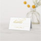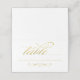 Une carte d'accompagnement de mariage raffinée présentant le mot "table" dans une écriture calligraphique dorée fluide avec un ornement décoratif sur un fond blanc croquant. Le contraste lumineux entre les lettres dorées et le papier blanc propre crée une apparence fraîche et classique pour vos tables de réception. Chaque carte pliée en tente arrive pré-marques de pliure, et les noms des invités et les affectations de table sont remplis à la main.