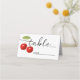Une carte de table simple et design rouge et blanc mariage avec deux cerises vintages rouges chic et une feuille verte sur un arrière - plan blanc immaculé. Le design est complété par un texte personnalisable sur le devant et le dos, écrit en calligraphie noire élégante. Idéale pour ajouter une touche de charme à un mariage bohème rustique, cette carte allie beauté naturelle et esthétique épurée et minimaliste.
