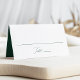 Cartes de table de mariage modernes avec une écriture calligraphique vert foncé sur fond blanc. Le verso des cartes de table avec écriture verte comporte vos initiales de monogramme affichées en lettres blanches avec votre date de mariage indiquée en dessous sur un fond vert. Les cartes de table avec écriture élégante sont parfaites pour les réceptions de mariage modernes, les dîners de répétition et d'autres événements spéciaux.