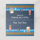 Cette carte de lieu mignonne et amusante comporte un petit singe marin sur une terrasse en bois avec un mouette et un crabe. Dans l'arrière - plan il y a un phare rouge et blanc, un oiseau mignon sur un voilier, des vagues de l'océan et un ciel étoilé bleu marine. Le texte combine des polices audacieuses et serif pour un look élégant et moderne. C'est parfait pour une fête d'anniversaire à thème nautique.