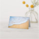 Carte avec photo d'une plage de sable brun doré au surf mousse blanc.
