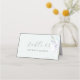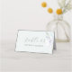 Jolie et délicate carte d'hôte bleu et violet fleuri quinceanera avec nom et numéro de table sur un arrière - plan bleu pastel.