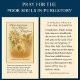 Une carte de prière catholique révérente honorant une âme pauvre en purgatoire. L'avant présente une illustration vintage d'une âme qui se lève dans la prière au milieu des flammes purifiantes, réconfortée par un ange gardien avec une thurible dorée, entourée de roses délicats. Le message sincère dit : "S’il vous plaît, ne supposez pas que je suis au Ciel... Priez pour moi." L'envers offre Une Prière Spéciale pour Notre Départ pour invoquer la miséricorde de Notre Seigneur pour les âmes qui souffrent. Idéal pour la Fête de l’Âme, les funérailles ou les bouquets spirituels. Une manière significative d'offrir la prière et la consolation par le trésor de l'Eglise. Que la lumière perpétuelle les éclaire, Seigneur.