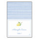Ce design est vendu sous forme de carte plate de 3,5 x 5 pouces que vous devrez plier (ou marquer et plier) en deux vous-même pour créer des cartes de placement individuelles ou des cartes de buffet d'une taille pliée de 3,5 x 2,5 pouces. Ce design classique présente un citron unique à l'aquarelle avec des feuilles, avec des rayures seersucker bleu moyen et blanc au verso.