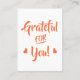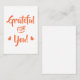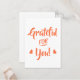 Donnez un ton chaleureux et accueillant à votre table de vacances avec cette carte de Thanksgiving avec l'expression manuscrite Grateful For You! en caractères oranges gras. Une façon parfaite de montrer l'appréciation à la famille, aux amis et aux invités pendant le dîner Thanksgiving, Friendsgiving, ou tout rassemblement d'automne. Ajoute une touche chaleureuse à l'animation saisonnière.